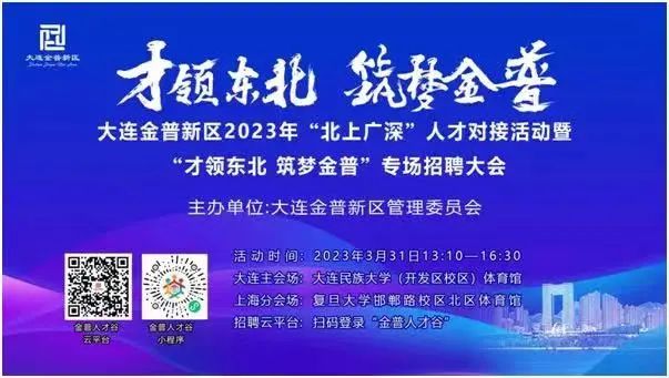 大连金普新区拟于2023年3月31日举办“北上广深”东北籍人才对接系列活动,赴北上广深各地开展招聘,首站设置包括大连民族大学主会场及上海复旦大学分会场。